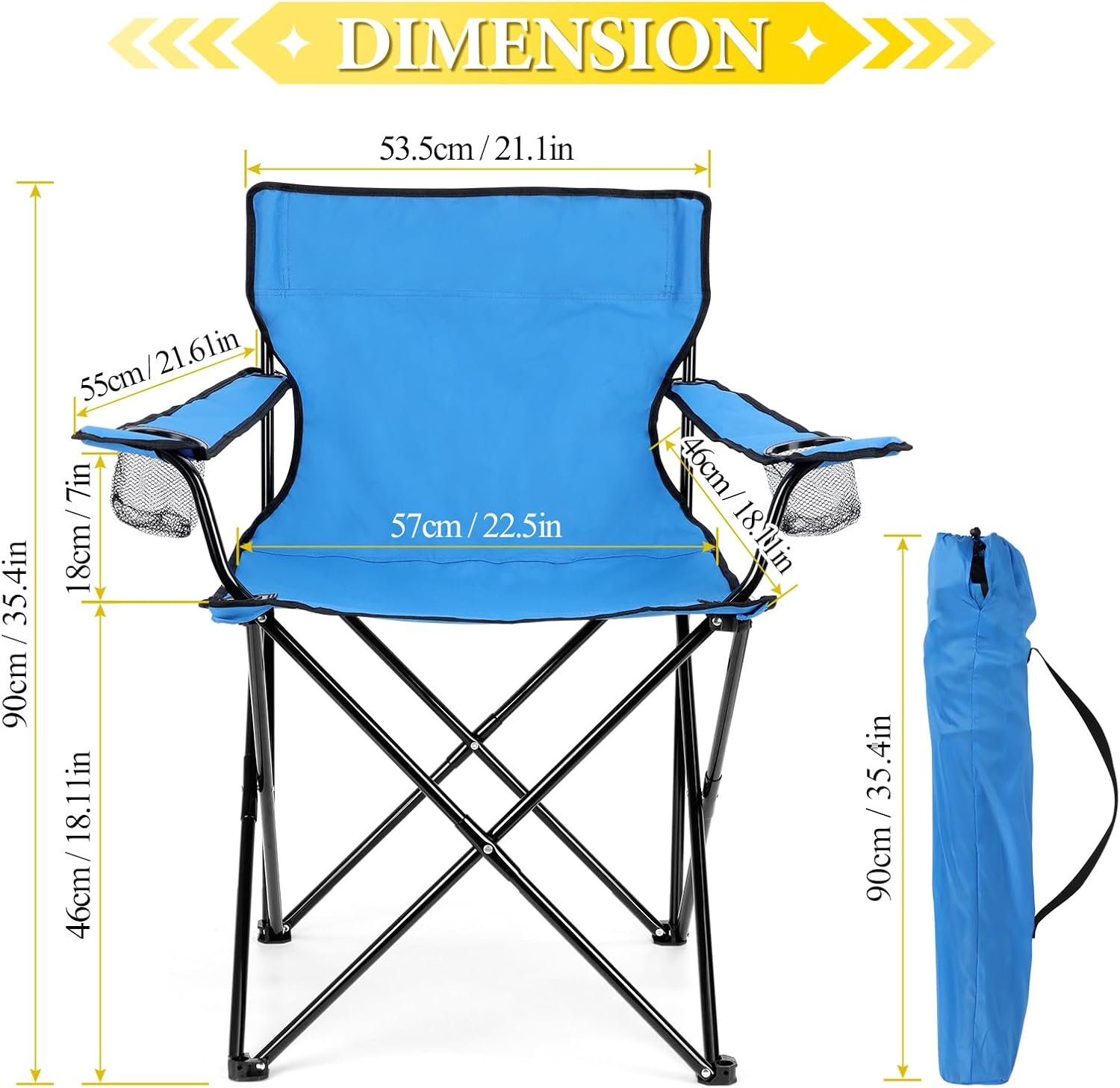 - [Adult Unisex Size] – Total height of our camp chair is 35.4 inches, of which seat cushion is 18.1 inches above floor to relax your legs, 22.5×18.1 inches of seat cushion has sufficient space for a man or woman to stretch out, 21.1in wider backrest fully supports your back and shoulders, No worry about the size being too small to fit